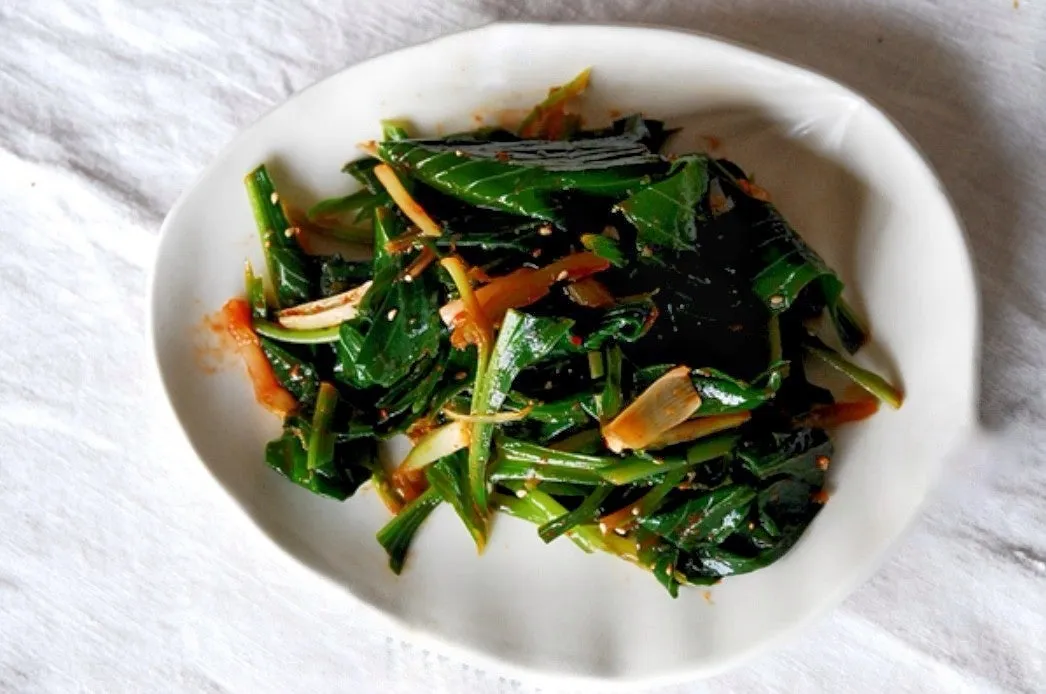 비비추김치는 일단 상큼하다. 엉개잎 머구잎 같은 데서 나는 쓴맛이 전혀 없고 오히려 약간 달착지근하다. 게다가 빛깔이 신선하다. 비비추 순을 따 조금 데친 다음 양념으로 버무려 놓는데 다른 나물을 데치면 빛깔이 죽으나 비비추만은 살아 있다.