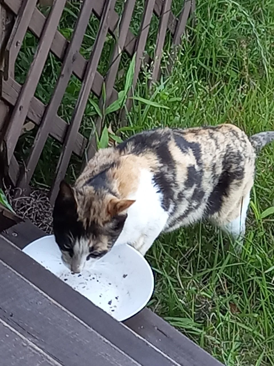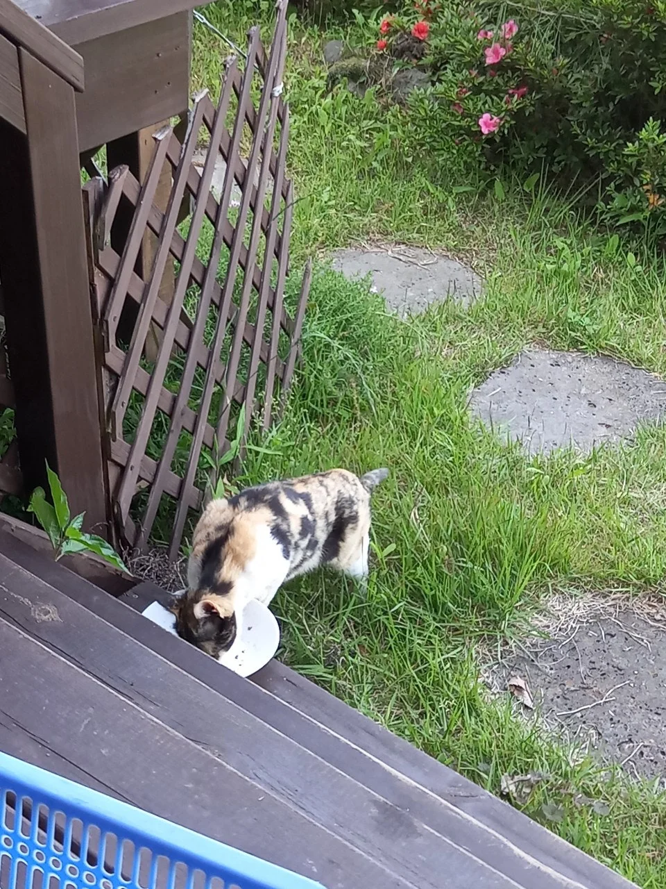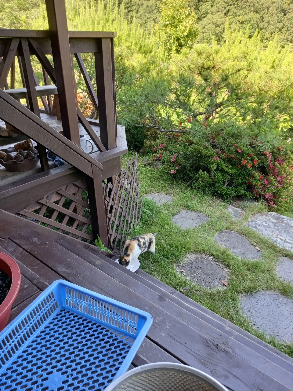 그 사이 많은 진전을 거듭해 온 결과 이제 드디어 1미터 앞까지 와 제가 놔둔 사료나 간식을 아무렇지 않게 먹습니다. 처음엔 녀석의 동료(어쩌면 부모)를 죽음에 이르도록 만들었으니 그에 대한 보상이라 여기면서도 사료비가 아깝고 때때로 사료 챙겨주는 일에 짜증도 났습니다.