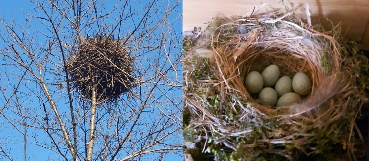 *. 위 사진에서 왼쪽은 까치집으로 사방이 막혀 있는데 비해, 오른쪽 참새집은 지붕이 없습니다.