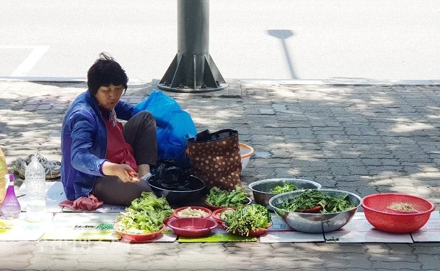 육교 아래 봄볕에 탄 까만 얼굴로 도라지를 다듬는