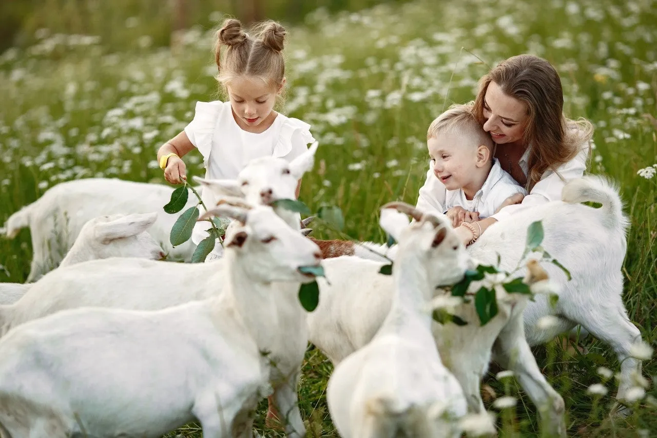 어미와 새끼 염소 세 마리가 장날 나왔습니다.