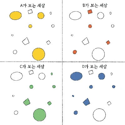 제가 그린 간단한 그림을 참고해 보세요. 어쩌면 사람들은 같은 곳에 있지만 제각각 다른 세상에 살고 있는지도 모릅니다. 각자가 무엇을 마음에 품고 있는지에 따라 세상이 다르게 보일 테니까요.