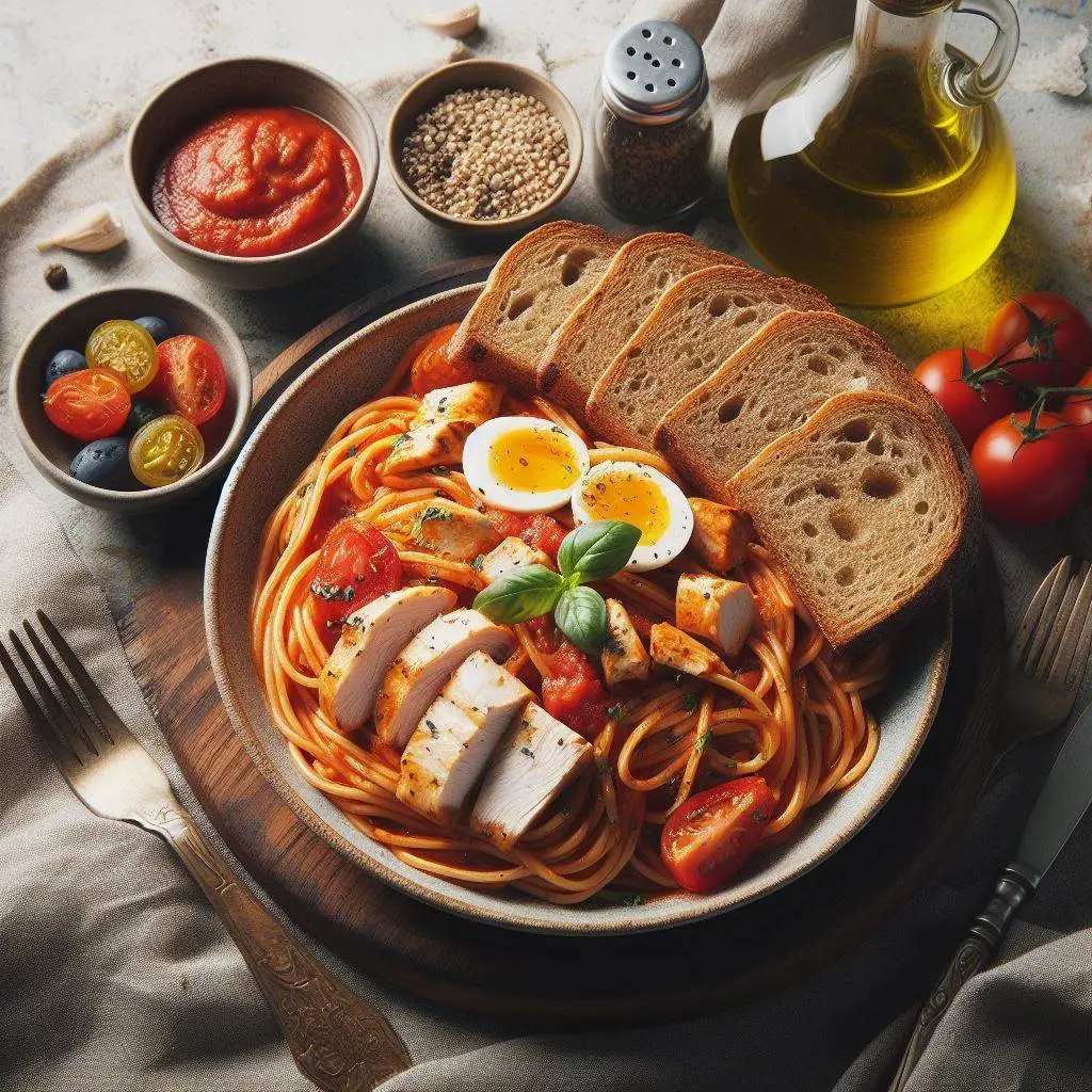 토마토 베이스 스파게티와 토마토 소스에 닭가슴살 추가