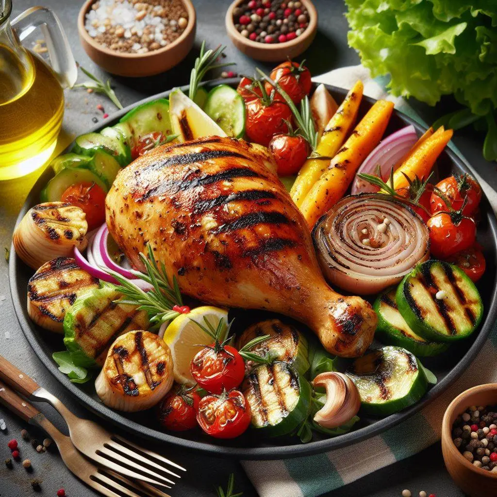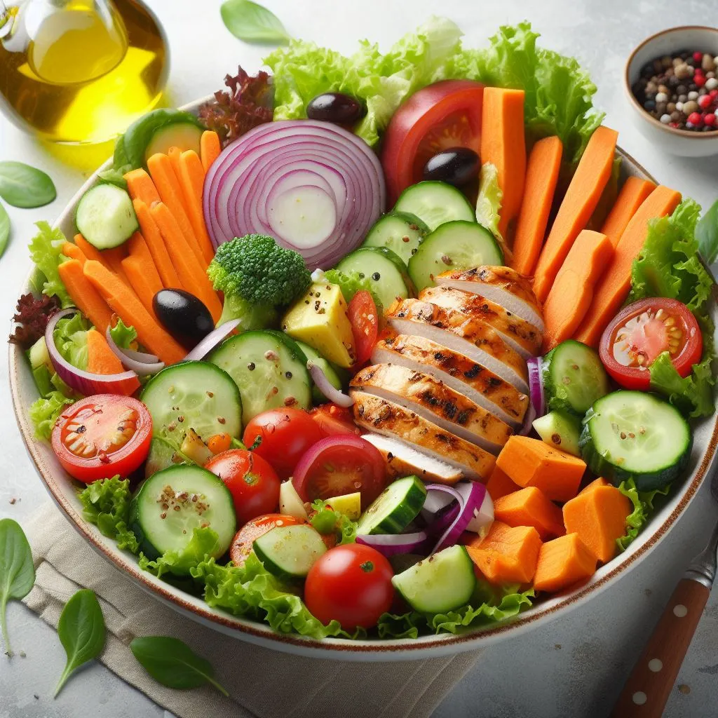 채소가 듬뿍 들어간 샐러드 (양상추, 오이, 토마토, 당근 등)에 그릴 또는 구운 닭가슴살 추가