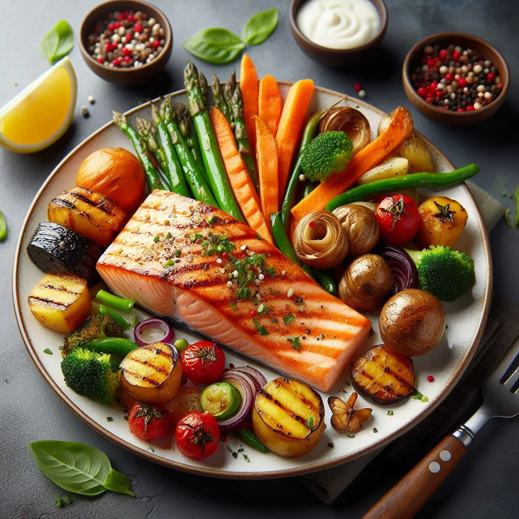 삶은 연어와 야채를 곁들인 식물성 샌드위치