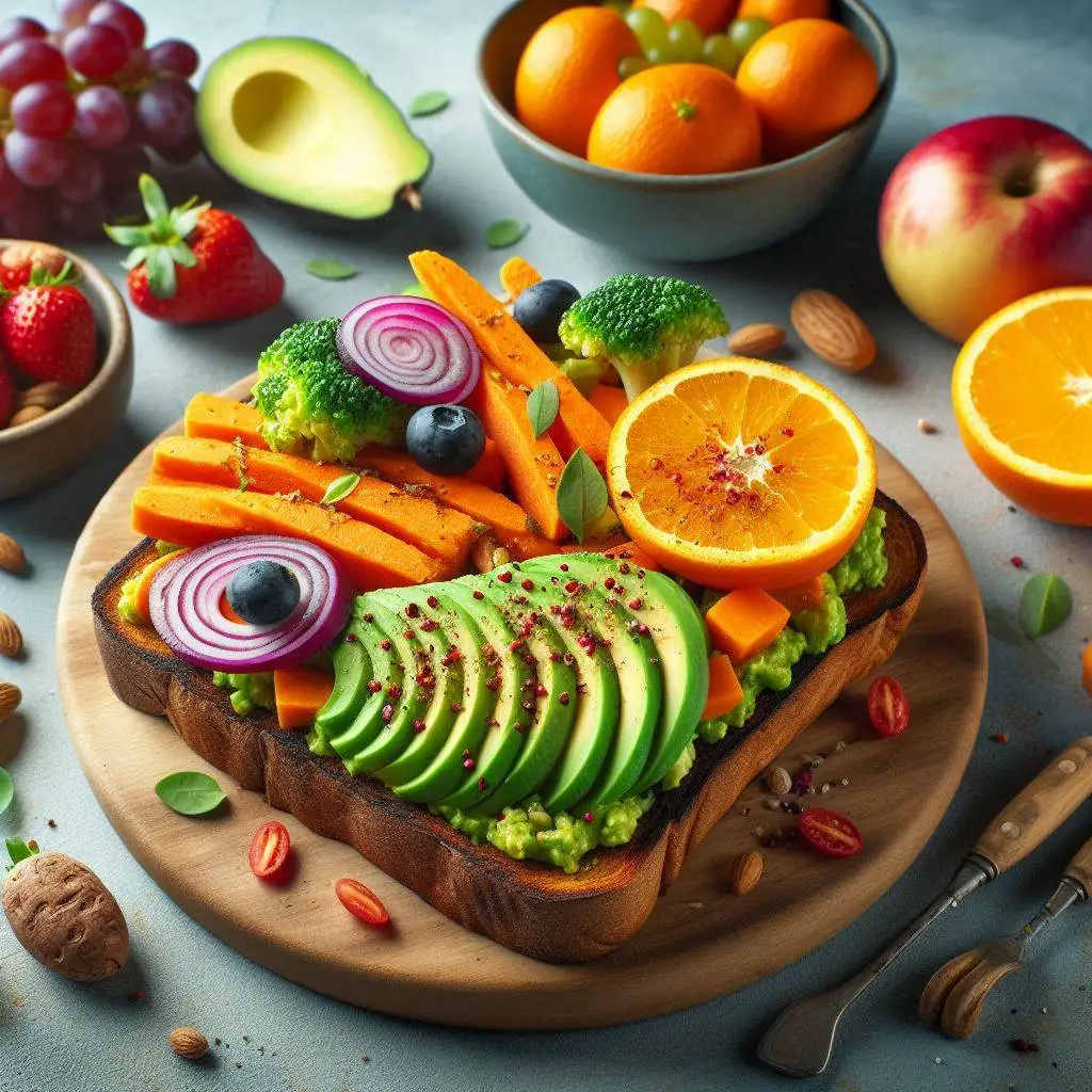 고구마 슬라이스에 아보카도와 야채를 올린 토스트