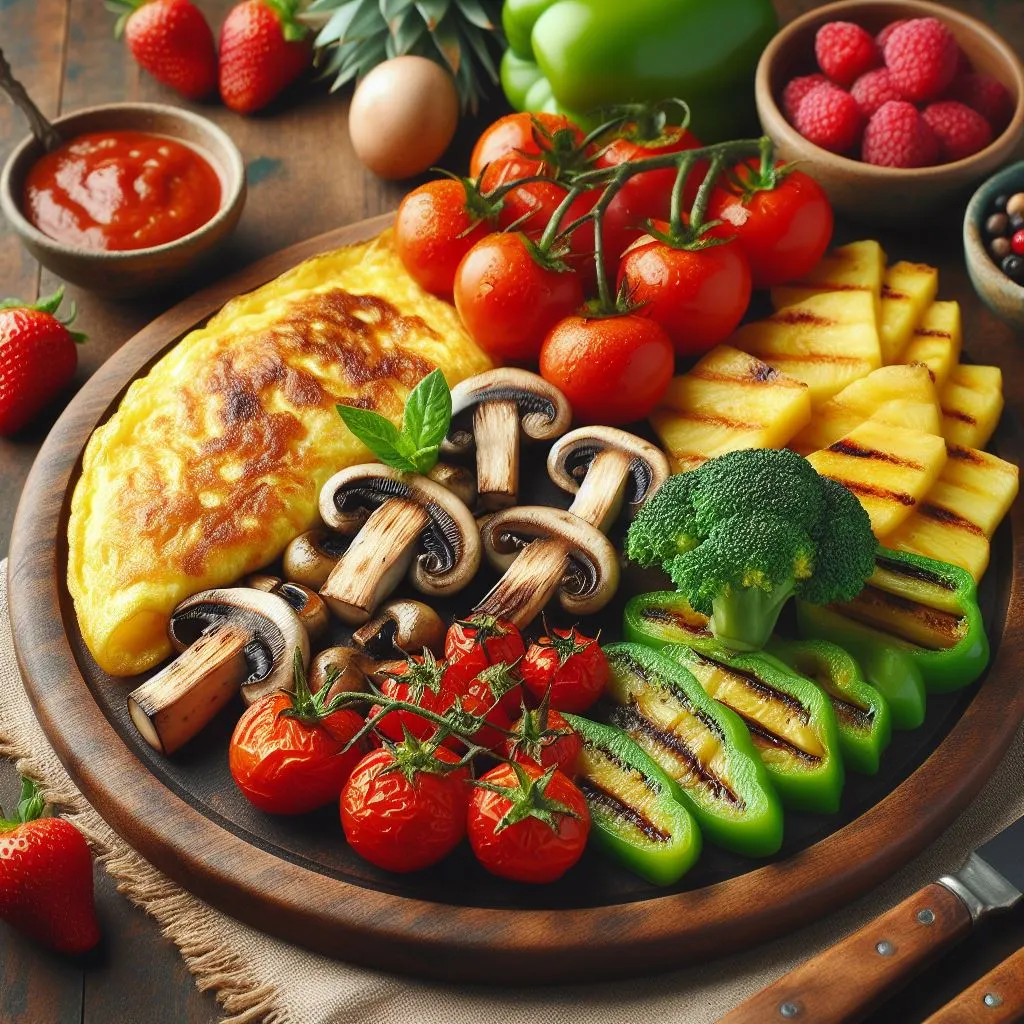 그릴된 토마토와 파프리카를 곁들인 양송이버섯 오믈렛