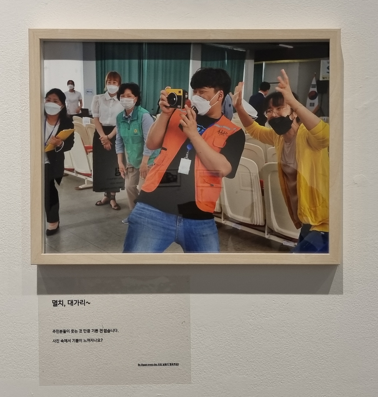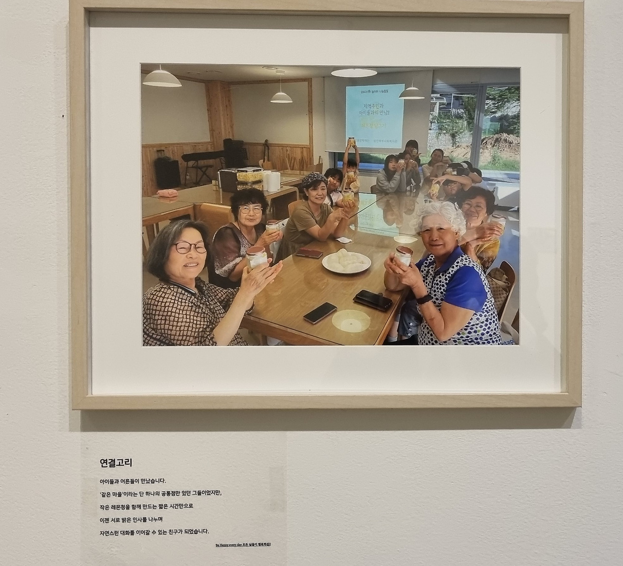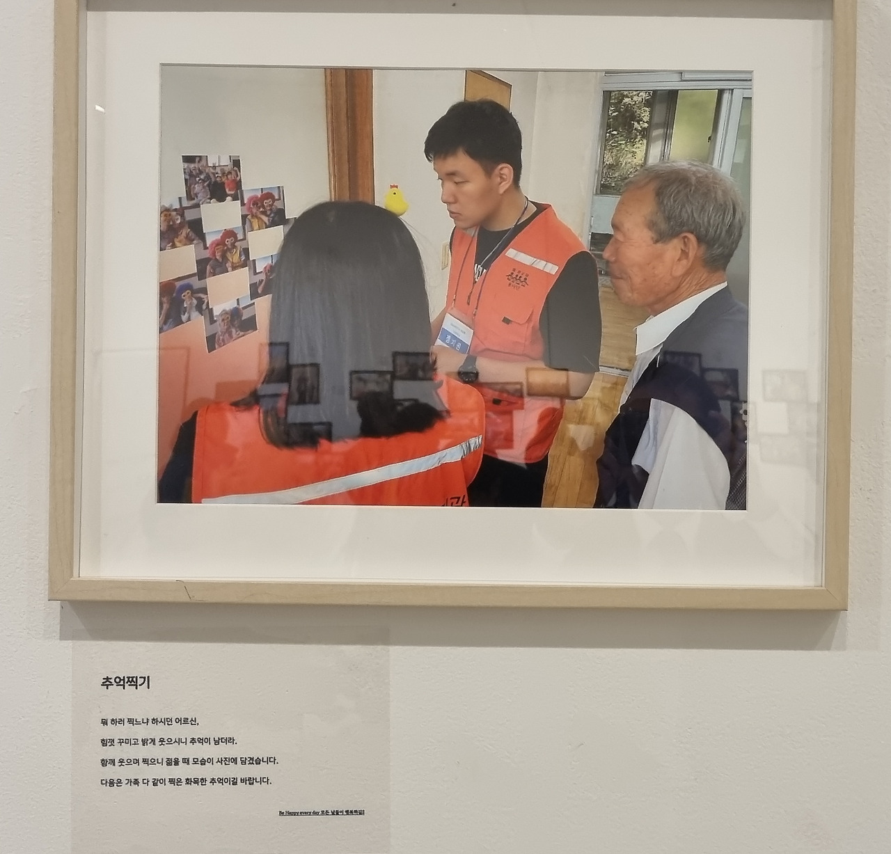 전시회에 도착하여 첫 번째 사진을 보면, 사회복지사가 노인들과 함께하는 모습을 담은 것 같습니다. 사진 속에는 밝은 미소를 지은 노인들과 친근한 표정을 지은 사회복지사가 함께 있는 모습이 보입니다. 이는 사회복지사들이 노인들에게 지지와 도움을 제공하고 있음을 보여줍니다.