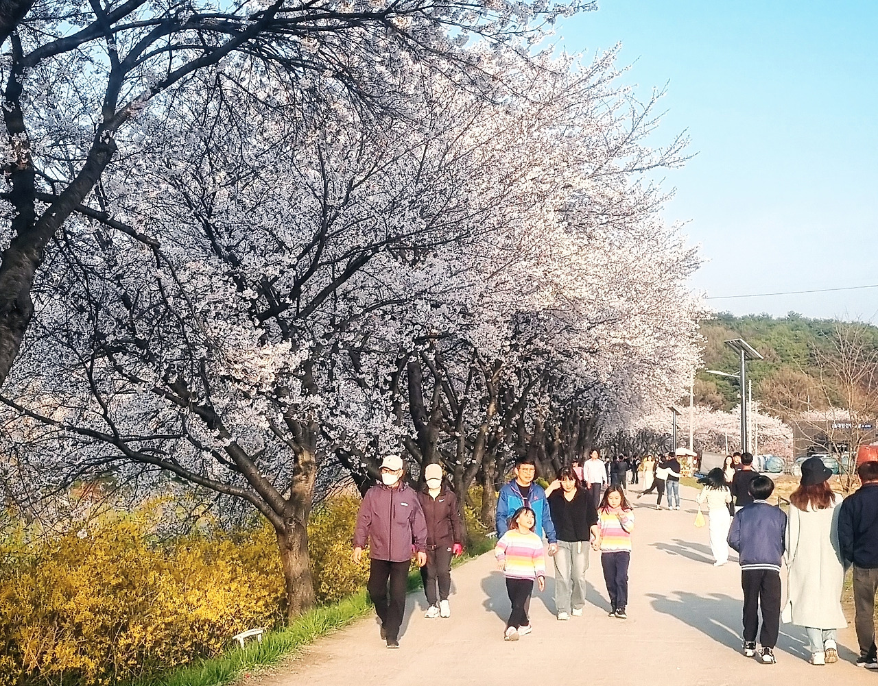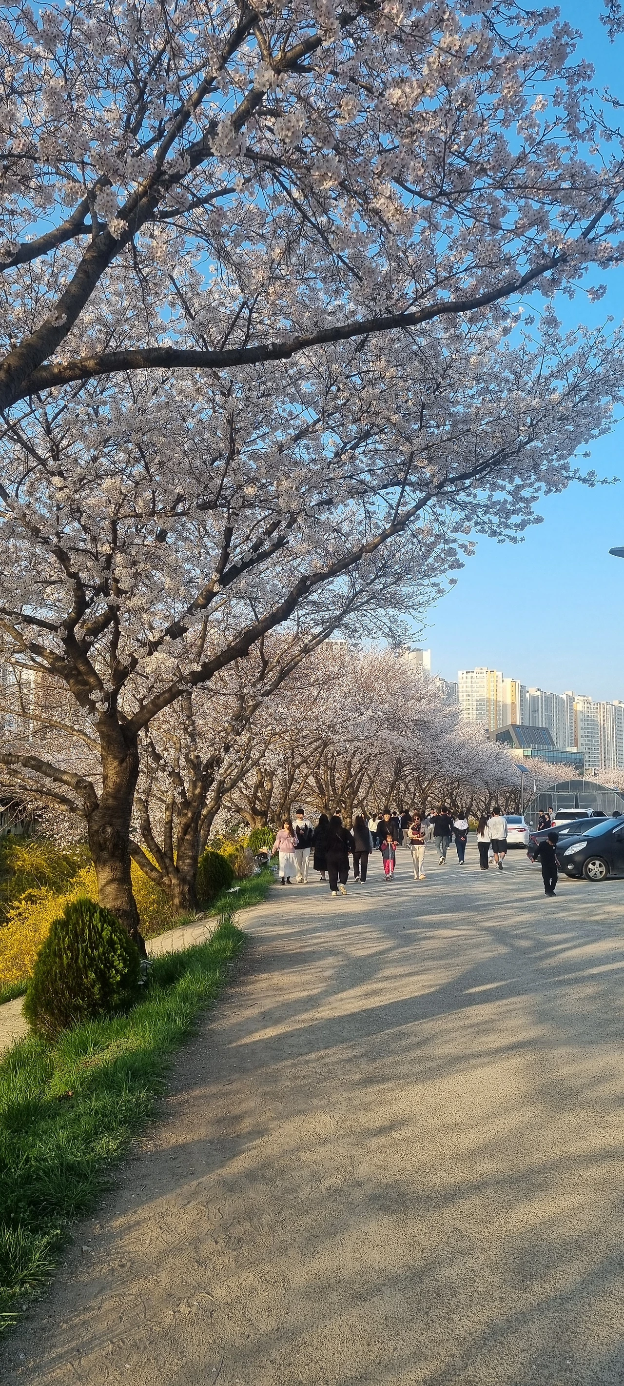 벚꽃이 만발한 길을 걸어가는 것은 마치 시적인 여행 같습니다.