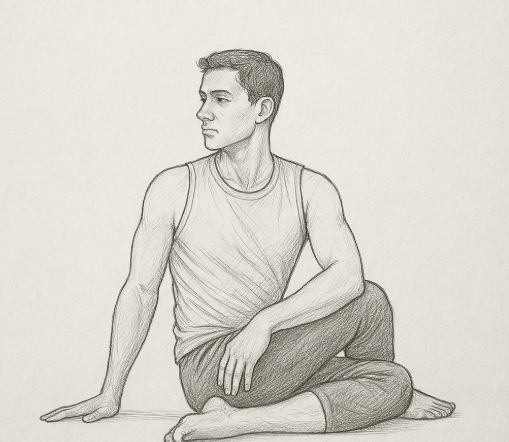 정자세에서 왼손을 오른 무릎에 가볍게 올려놓고, 오른손은 등 뒤 바닥을 짚는다.