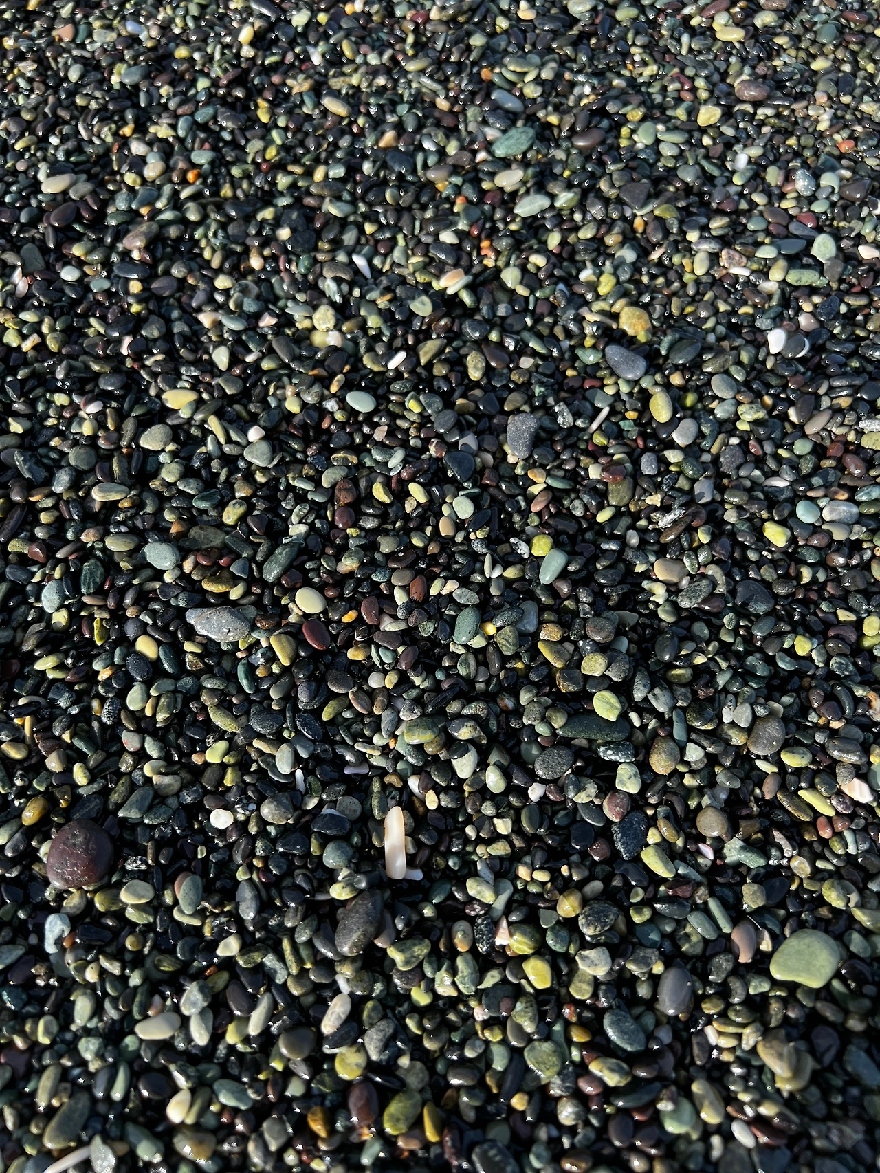 무언가 기대가 크면 실망이 큰 것 같은 느낌이다. 블로그나 후기들에서 봤었던 모양과는 많이 다르다. 그런데 그래도 이뻤다. 스읍,, 이쁘긴 한데.. 무언가 돌멩이들은 더욱 잘았고, 햇빛이 반사되어 반짝이는 것이 눈을 아프게 할 정도로 빛나기에는 무언가 부족하지만 각각의 알맹이의 색감은 알록달록하게 보이기에는 충분했다. 날이 조금 흐린 탓에 다소 안티 하게 느껴진 것일 수도 있지 않을까 한다. 그래도 엄청 반가운 모처럼의 바다였다.