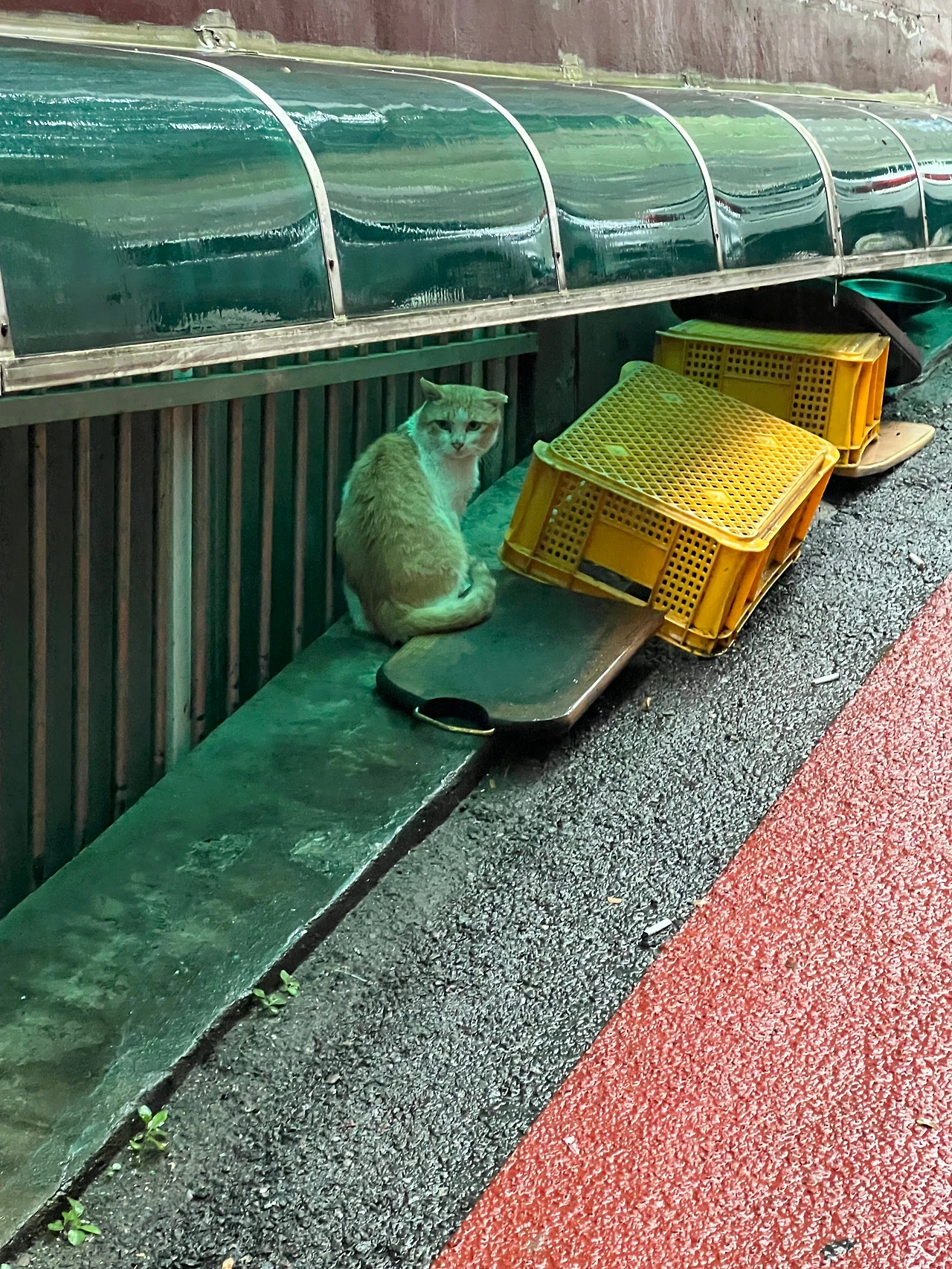 어느 비 오는 날 만났었던 고양이가 나의 보금자리 반지하 층의 천막에 앉아 비를 피하고 있었다.
