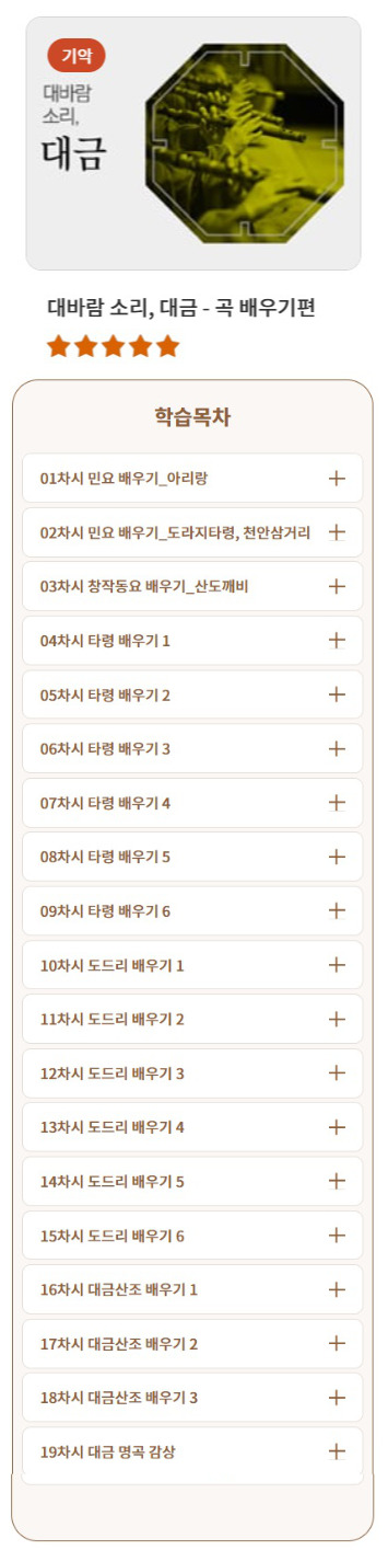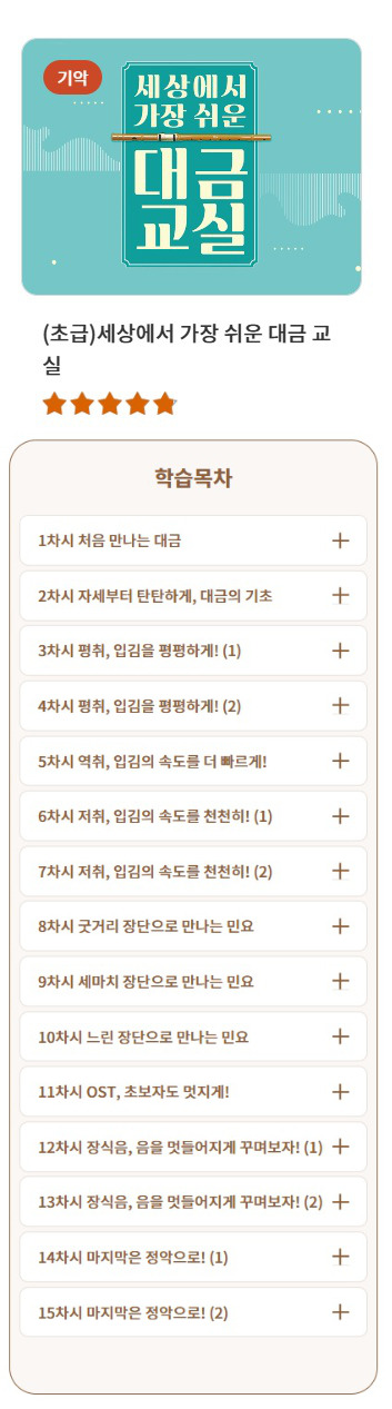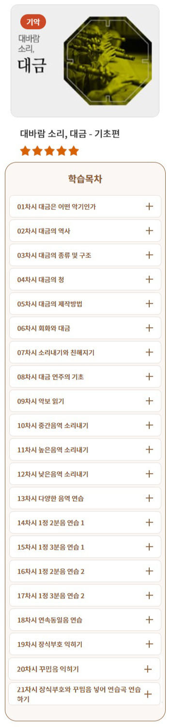 총 21개의 강좌이지만 7차시 부터 소리내기 연습이 시작됩니다. 대금의 역사적 배경을 설명하여 악기에 대한 이해도를 높일 수 있어 강추합니다. 음역과 박자를 배울 수 있는 연습곡이 있어 손풀기로 활용할 수 있습니다. 한꺼번에 욕심내기 보다 길게 보고 조금씩 연습하는것이 지치지 않고 마무리할 수 있습니다.