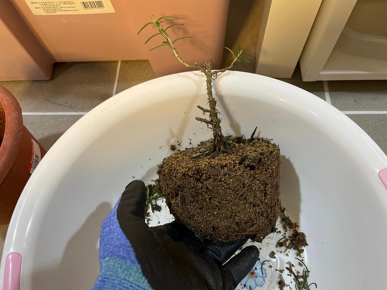 원래 들어있던 플분은 대강 씻어서 망을 깔고 마사를 먼저 넣었다. 유튜브 좀 구경했다고 다이소 가서 대뜸 사 왔는데, 세척을 안 하고 넣었다가 나중에 봉변을 당했다ㅜㅜ 다음엔 꼭 세척해서 넣어야지. 상토를 적당히 깔고 로즈마리를 넣고 둘레로 흙 채우고 상단에 뿌리를 덮을 정도로 흙을 더 넣어주었다.