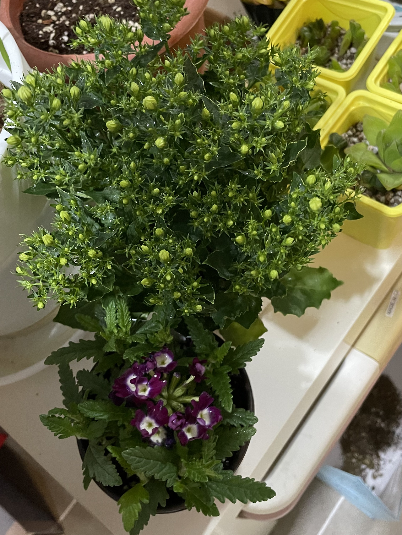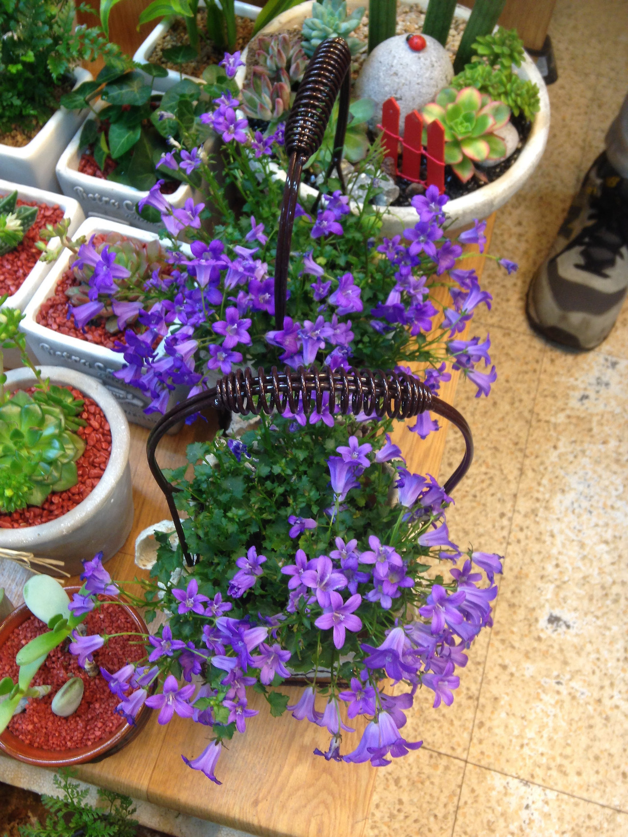 결국 예산을 크게 초과하고 말았다. 애가 클수록 화분도 또한 비싸진다. 최대한 타협하여 플라스틱 화분으로 선택했다. 물도 많이 먹으니 나쁘지 않을 거라고 마음을 다독였다. 안 죽이고 키울 자신 있으면 데려오라고 선뜻 오케이를 날린 남편이 그렇게 멋있을 수가 없었다. 입이 귀까지 찢어져서는 화분을 고이 안고, 마침 근처에 있었던 장미 캄파눌라까지 한 포트 골랐다. 보라색 꽃은 없었지만 흰 꽃도 예쁘다 싶어 고민 없이 샀더니 작은 버베나를 하나 끼워주셨다. 보라색 좋아하시나 봐요? 하며 건네주셨는데, 제가 붉은보라는 좀 취향이 아닌데요... 하지만 공짜는 언제나 옳다.