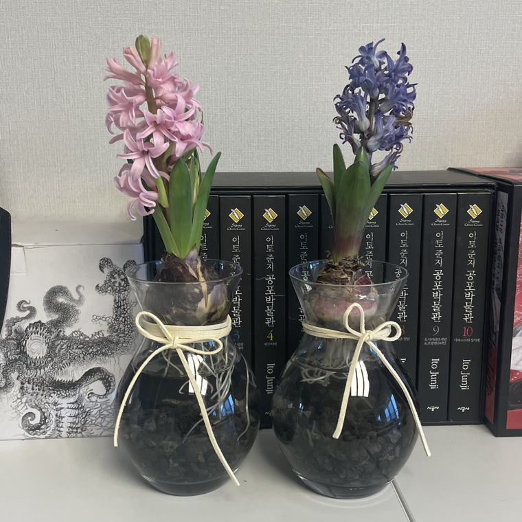 젤 먼저 집에 찾아온 히아신스. 작은 애기들로 시작했다가, 각자 예쁜 꽃과 향기를 선물하고 꽃대가 잘린 채 이파리만 쑥쑥 자라고 있다. 제일 상태가 안 좋았던 아이는 제일 먼저 초록별로 떠났다...