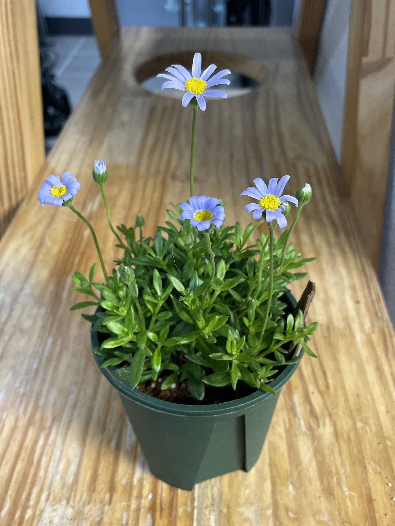 일회용 컵을 사용한 에코 화분 만들기 이벤트에 참여했다. 내 픽은 무스카리였지만 아들은 굳건히 블루 데이지를 밀었다. 예상치 못하게 랜덤 뽑기로 식물을 받게 되었고 사계국화에 당첨되었으나 친절하신 주변 분께서 블루 데이지와 교환해 주셨다. 화분과 흙이 마음에 차지 않아 집에 오자마자 분갈이를 다시 해버렸다. 남은 일회용 컵은 삽목 용으로 써보려고 한다. 봉오리를 달고 왔는데 하나 둘 꽃이 피고 있다.