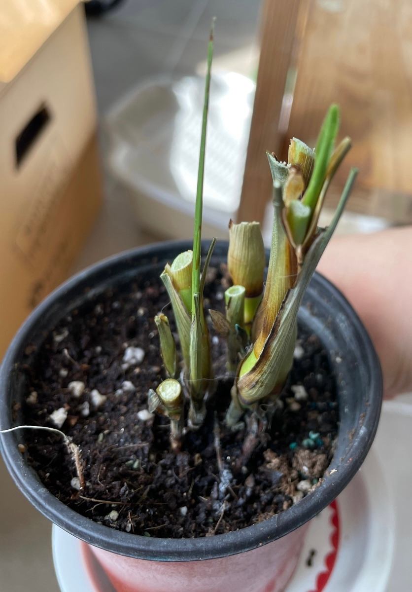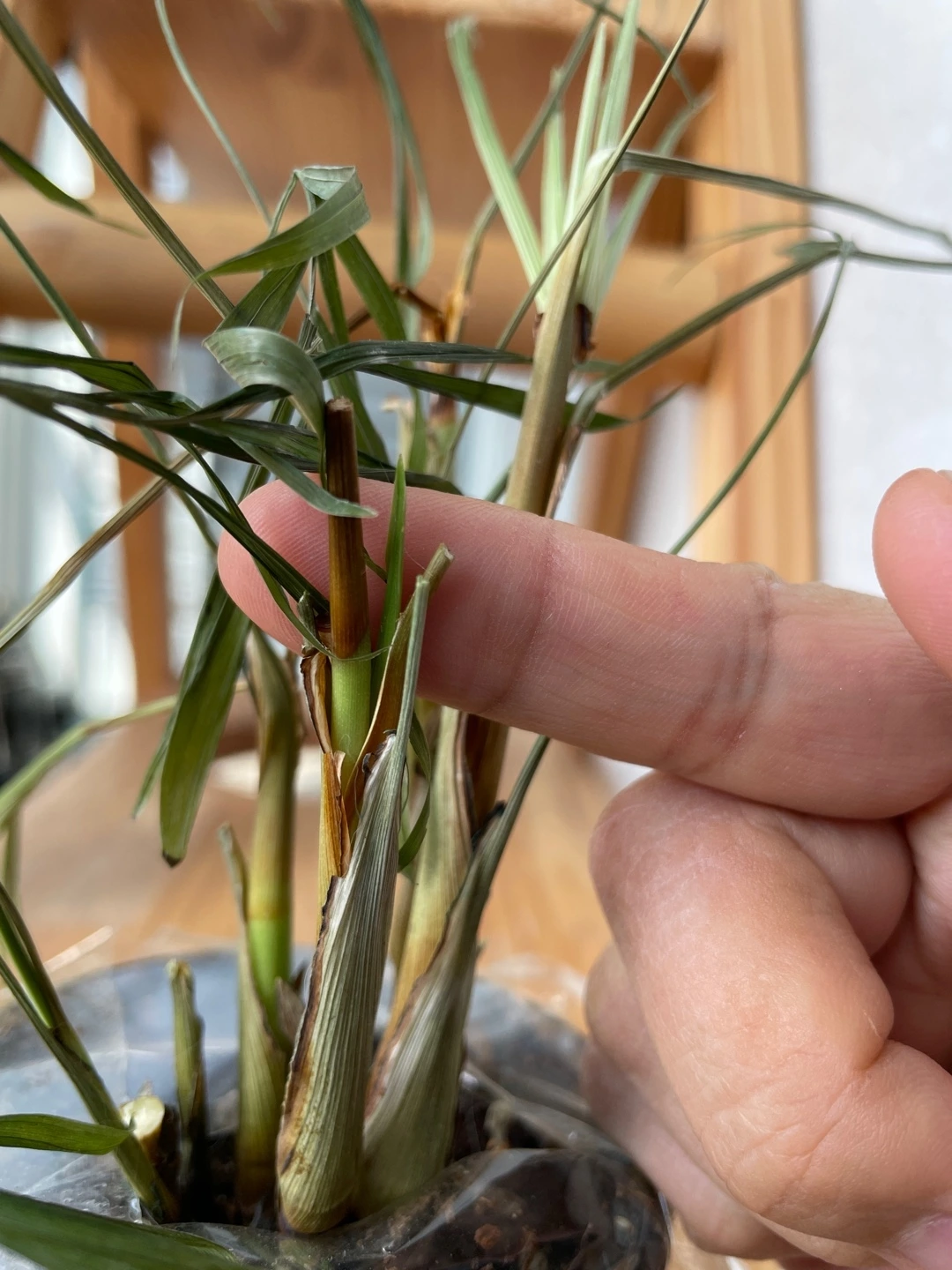 그런데 막상 집어든 화분은 예상하던 상태가 아니었다. 의외로 무게가 좀 있었고, 흙이 축축했다. 일단 남편에게 질문했다. 너 야자 물 줬니..? 의아하다는 듯 아니? 하고 대답하는 소리가 들린다. 그럼 그렇지, 연구실에 있는 스투키도 물을 말려서 열 가닥 중 두 가닥을 죽여버렸다는 남편이 야자한테 물을 챙겨줄 리가 없다. 친구들에게 물어보니 야자가 물을 빨아들이지 못한 것 아니냐고 한다. 이게 말로만 듣던 과습 후 뿌리 사망 루트인가...???? 오자마자 물을 잔뜩 주고 고양이가 뜯기 쉽게 테이프를 덮어 감아 고정해 주었는데, 아마 그 때문인 것 같다. 말라서 죽어버린 이파리들을 잘라내며 줄기 단면을 보니 아직 초록색이 남아있기는 한데..