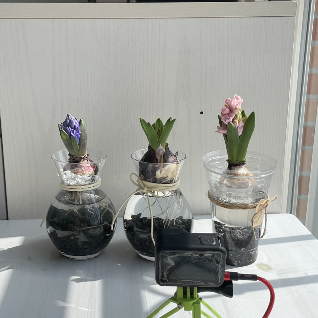 보라색 구근의 뿌리도 어지간히 잘려나갔지만, 몇몇 긴 뿌리가 다행히 잘 버텨주었다. 구근의 크기도 (그 당시엔) 유리병에 잘 거치할 수 있을 만큼 컸다. 그런데 문제는 분홍색이었다. 뿌리가 남김없이 잘려나갔고, 심지어 구근이 작아 유리병 속에 퐁당 빠져버렸다. 그리고 두 구근 모두 곰팡이가 피어 있었다.