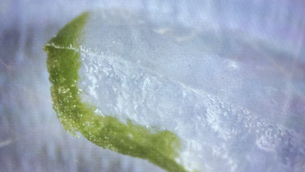 그렇다면 겉에서 하얗게 보였던 그 부분은 과연 단면이 어떻게 되어 있었을까? 엽록소층과 육질 사이에 텅 빈 공간이 있었다. 물로 차 있는 육질이 바닥면에서 떨어지면서 그 부분이 초록색이 아니라 하얗고 투명한 색으로 보인 것이었다. 놀라워라. 이유를 찾아버렸네?