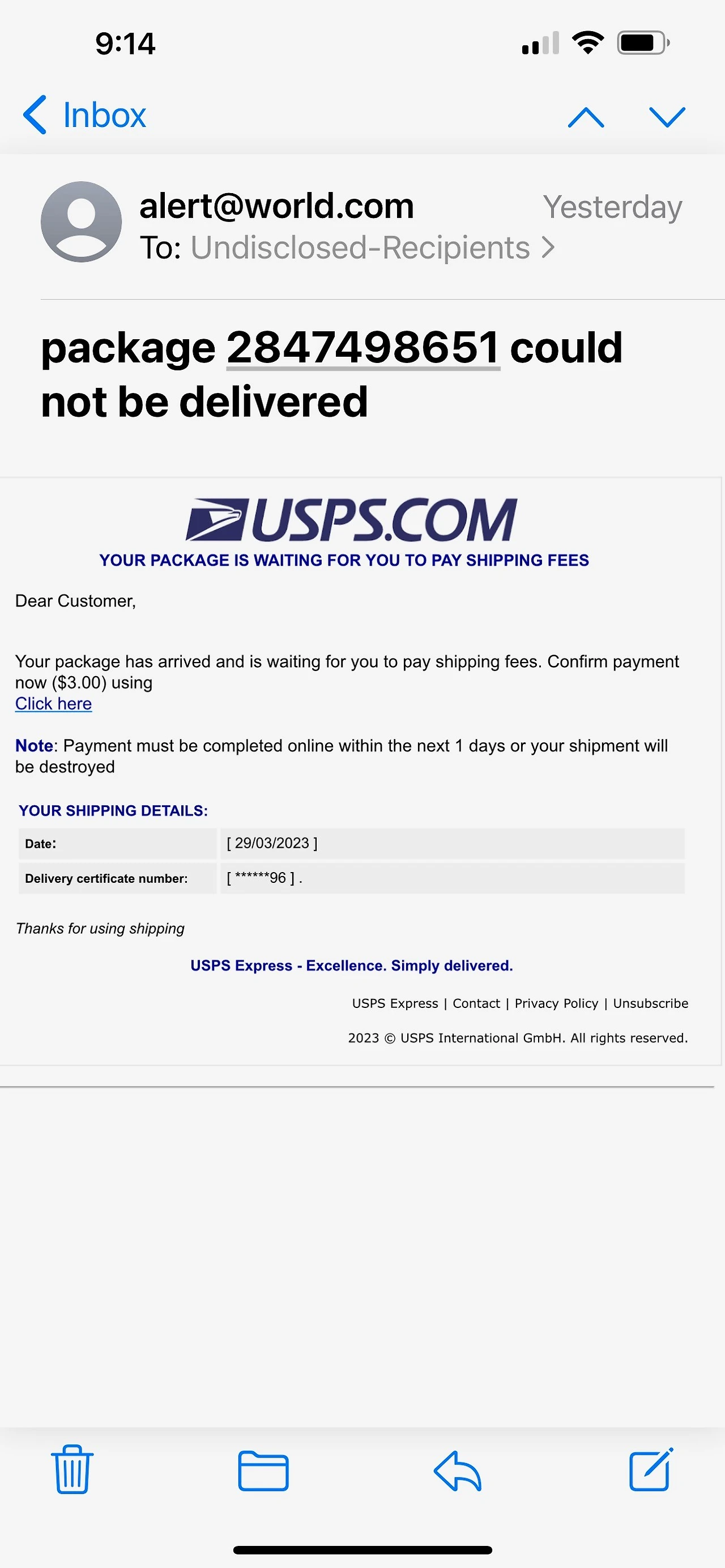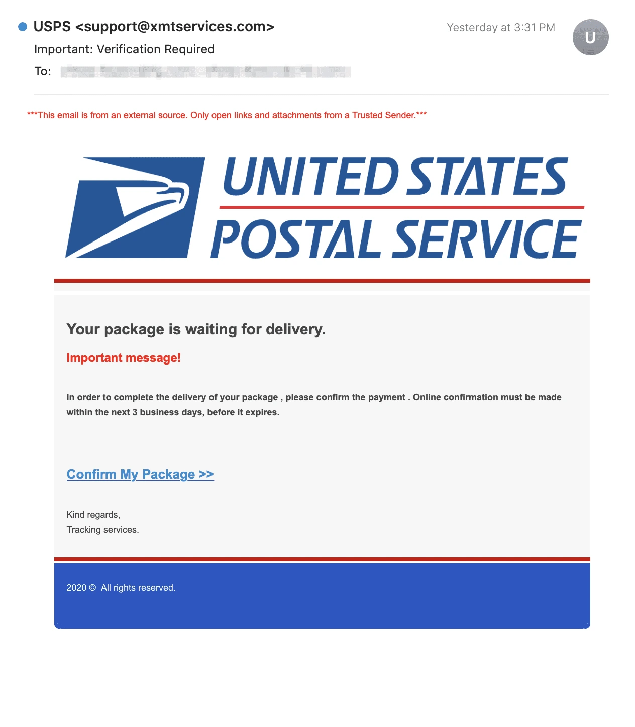 필자도 우체국 USPS 메시지를 받았다. 내용은 제 앞으로 택배가 왔는데 주소가 확실치 않다며 수정 요구를 해왔다. 이름, 주소, 추가 배송비 카드까지 기입하라는 링크가 엄한 페이지로 유도한다.