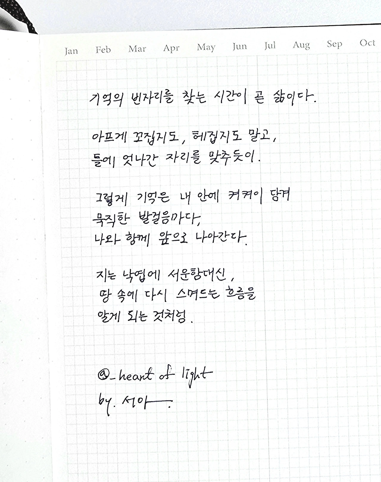 기억의 빈자리를 찾는 시간이 곧 삶이다.아프게 꼬집지도, 헤집지도 말고,틀에 엇나간 자리를 맞추듯이.그렇게 기억은 내 안에 켜켜이 담겨묵직한 발걸음마다, 나와 함께 앞으로 나아간다.
