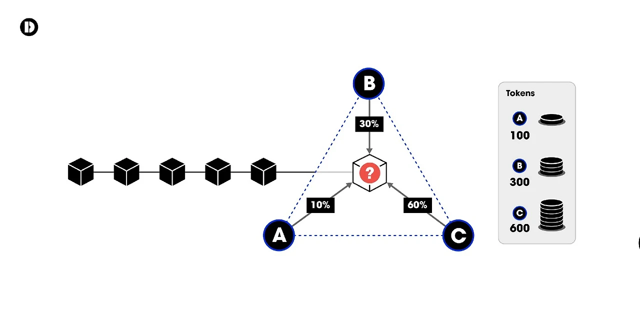 예를 들어 전체 10,000개의 토큰이 유통되는 블록체인이 있다고 생각해보겠습니다. 이 블록체인 네트워크에 참여하는 검증인, 즉 블록 생성에 관여하는 주체는 모두 A, B, C 셋이며, 각각 100개, 300개, 600개의 토큰을 보유하고 있습니다. 각각의 검증인들은 각자의 토큰을 담보물로 ‘스테이킹’하여 블록 생성과 검증 과정에 참여할 수 있게 됩니다. A, B, C가 각자 보유하고 있는 코인을 모두 스테이킹하여 블록 생성 과정에 참여한다면 전체 블록 생성에 관여하는 토큰, 즉 총 스테이킹량은 1000개가 됩니다. A는 총 1000개 중 100개, 즉 총 스테이킹량에서 1/10의 지분을 차지하고 있습니다. 지분증명 블록체인에서는 다음 블록을 A가 생성할 확률이 A의 지분에 따라 역시 1/10(10%)이 되는 방식으로 구현되어있습니다.