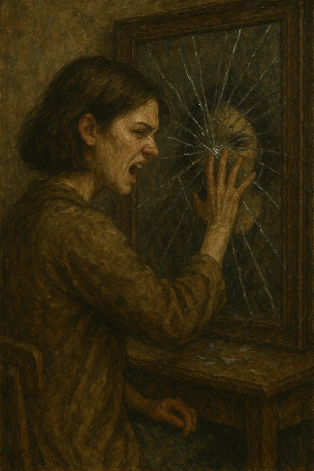 유리에 비친 자신의 모습이 아주 희미하게 드러났다.