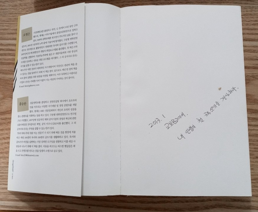 나는 사는 동안 책 한 권을 써보고 싶은 바람이 있다. 굳이 꿈이라고는 말하지 않겠다. 그리 강력한 소망이 아니니까. 어느 날 문득 또 책을 쓰고 싶은 생각이 들어 책꽂이에서 '내 인생의 첫 책 쓰기' 책을 찾아 꺼냈다. 책 표지를 넘기니 '2013년 1월, 교보문고에서 내 인생의 첫 책 쓰기를 결심하다'라고 적혀있다.