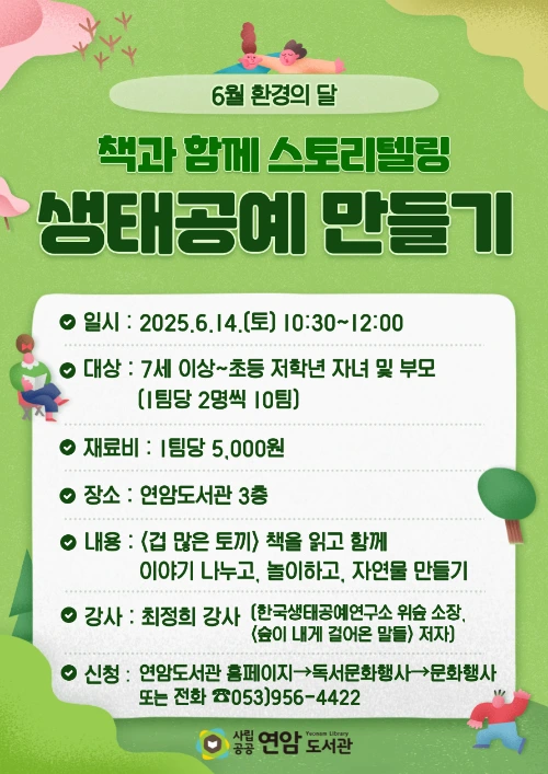 동화, 소설, 역사, 환경 등 이야기 +토론+ 자연물 작품 만들기+ 작품 감상과 토론 순서로 진행합니다.