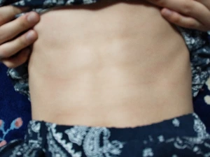 아인이가 스스로 신기해하고 있다 _ 갈비뼈가 아니고 근육이고, 배에는 '식스 팩' 선이 도드라진다.