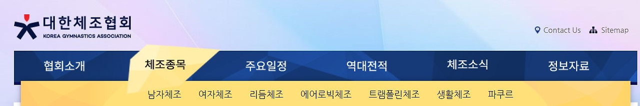 대한체조협회 사이트에 들어가 보면 체조 종목이 기계체조, 리듬체조, 에어로빅, 트램펄린, 생활체조와 파쿠르가 있다는 것을 알 수 있다.