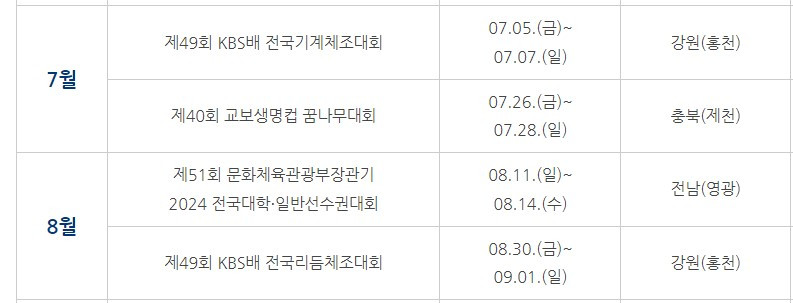 대회 일정을 찾아보면 이 종목들 대회 일정이 한꺼번에 나와 있어서 처음 보는 나로서는 익숙하지 않아서 한참 들여다보게 된다.