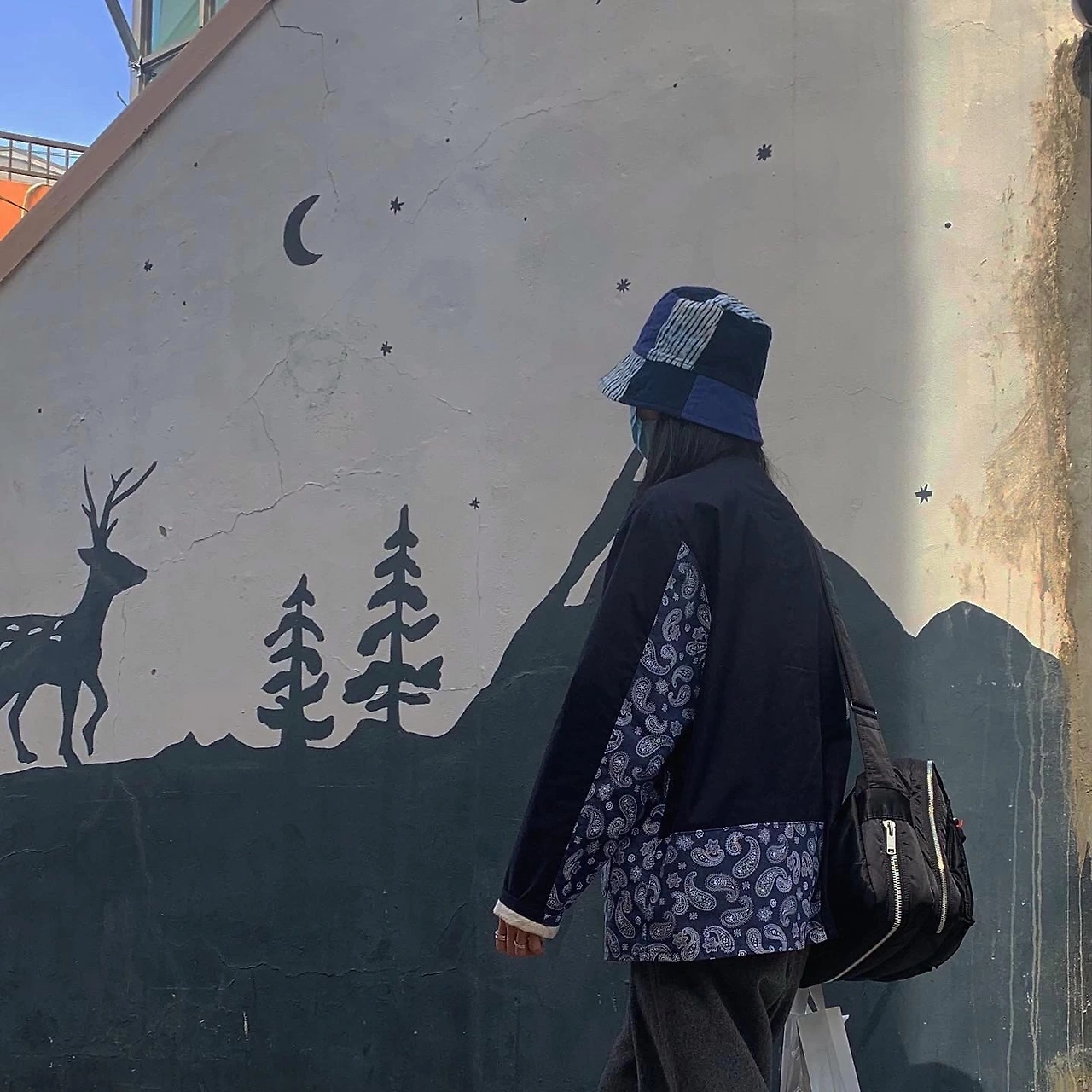 (L) 데님 원단의 조합으로만 매치한 룩이다. 상하의와 신발 모두 패턴 원단의 패치워크 아이템으로 다른 포인트 없이도 충분히 재미있는 스타일을 보여준다. 투머치를 지양하기 위해 상의는 패치워크 원단보다는 흰 무지 원단의 비율이 많은 제품을 선택해주었다.