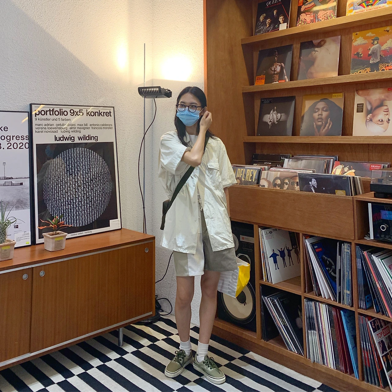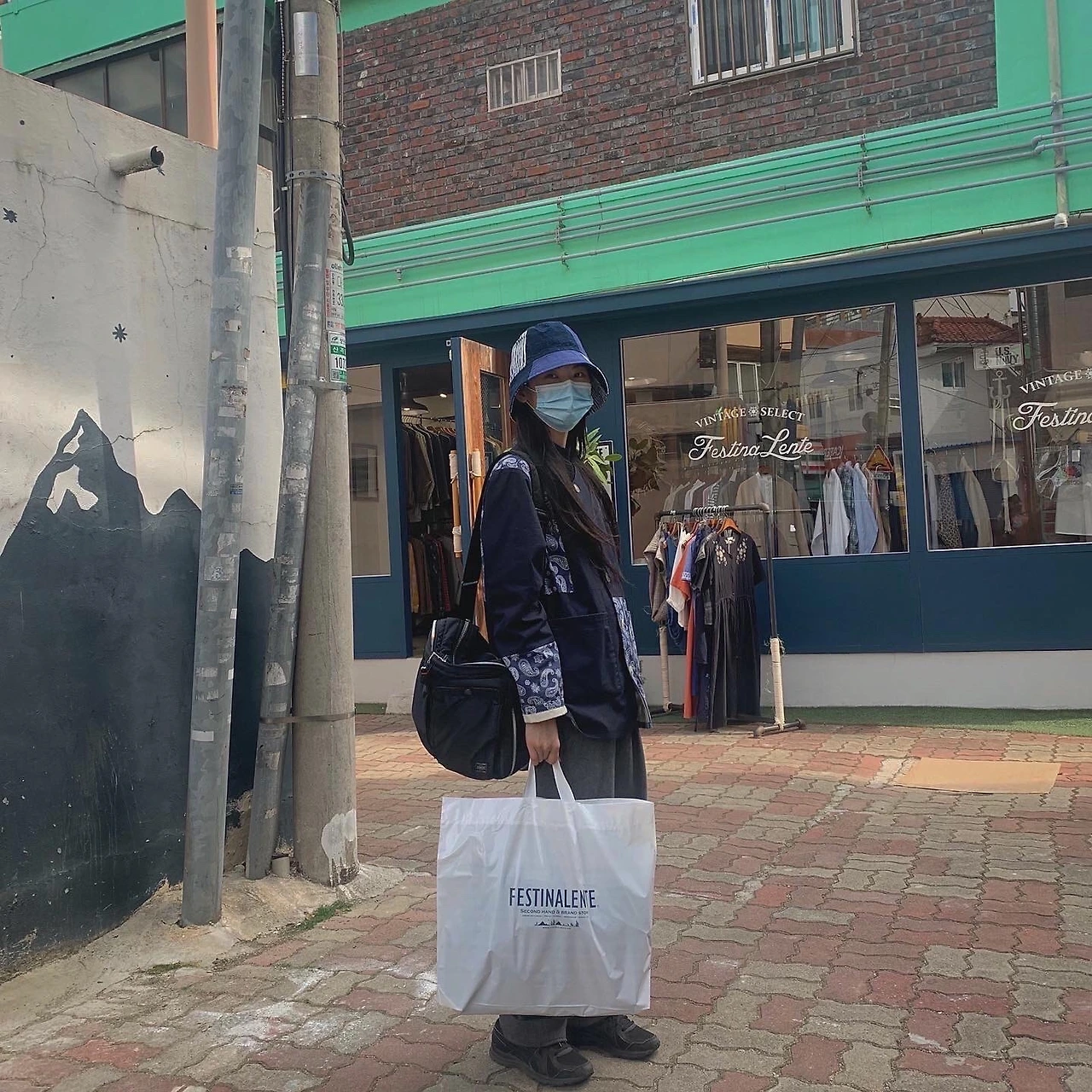 (R) 좌측 착장보다는 비교적 무난한 조합이다. 옅은 색상 탓에 자칫 밋밋해 보일 수 있는 조합에 카키 색상 신발과 가방을 매치하여 분위기를 만들었다. 카키 색상을 첨가해 심심해 보이지 않게 하되 그 힘을 조절하여 자연스럽게 포인트 아이템이 패치워크 팬츠가 되도록 한다.