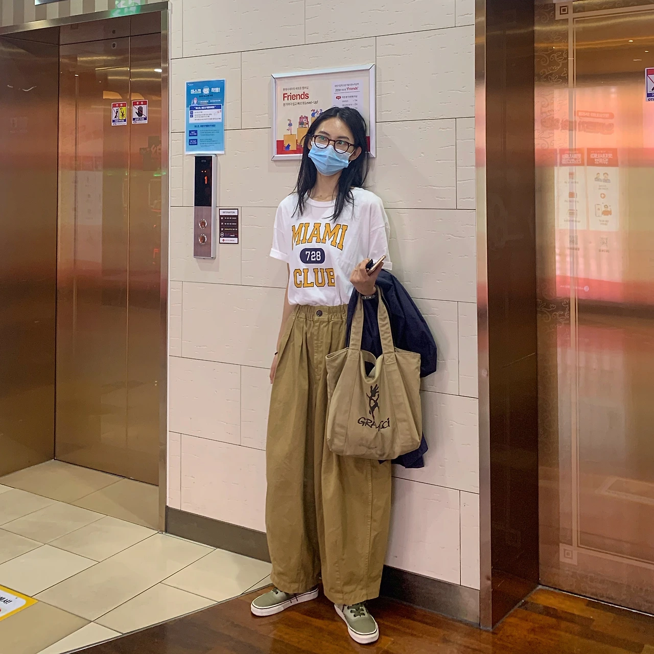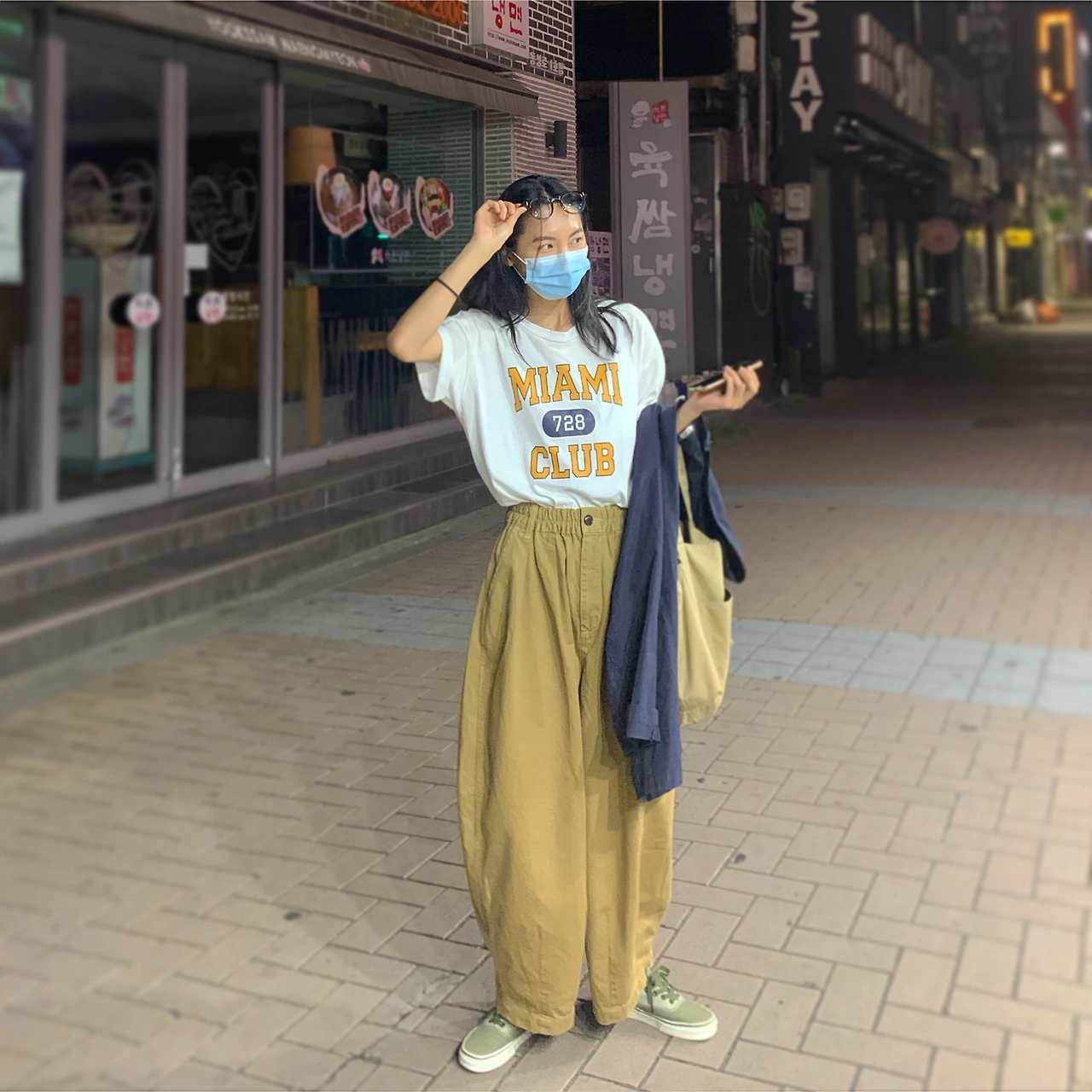 벌룬 팬츠에 미국 빈티지 티셔츠 느낌이 나는 프린팅 반팔 티셔츠를 매치하고 벌룬 팬츠와 비슷한 느낌으로 떨어지는 토트백을 들었다. 그 외에 카키색의 신발, 시계 등을 통해 샌드 컬러로만 이루어진 패션을 심심하지 않게 풀어준다. 티셔츠에 포함된 색인 네이비 색상의 얇은 자켓으로 포인트를 더해줬다. 여름밤 영화관에 간다면 혹시 모를 추위에 대비하여 자켓을 포인트로 선택해보자.