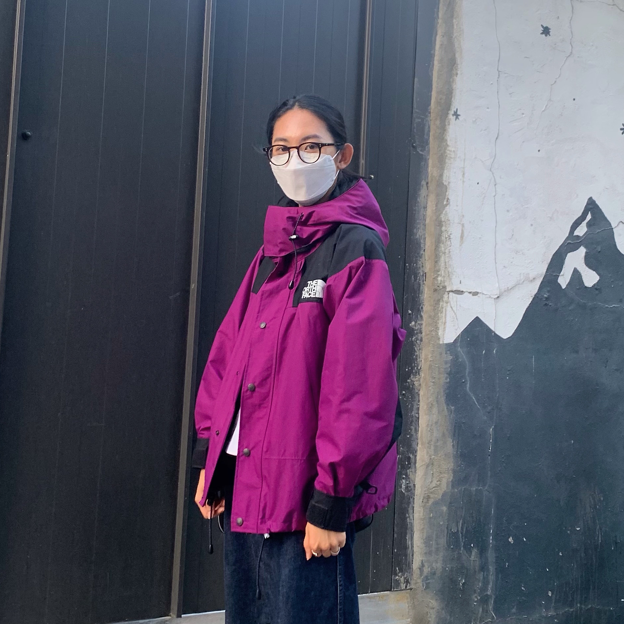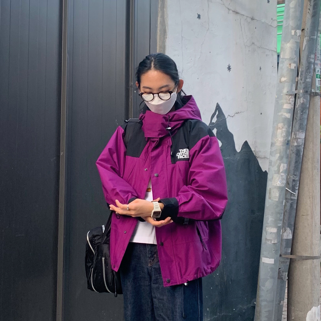 전반적으로 무난한 톤의 착장에 비 오는 날에도 든든한 자주색 고어텍스 자켓을 입어 색상에 포인트를 준 룩이다. 아웃도어 자켓을 걸쳤지만 안에 입은 옷은 청바지로, 등산이 아닌 패션 아이템으로서 고어텍스 자켓을 선택했음을 알 수 있다.