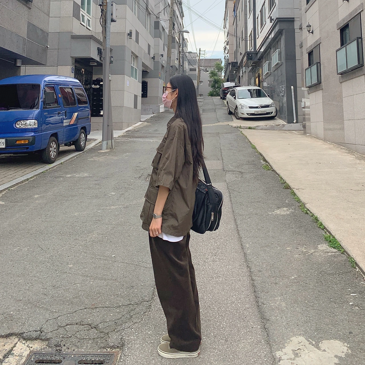 ( R ) 가벼운 나일론 소재의 셔츠 자켓에 브라운 컬러의 코듀로이 슬랙스를 매치하여 톤온톤으로 착용했다. 서로 다른 소재이지만 나일론 셔츠에 큰 포켓 디테일과 팬츠의 자작하게 들어간 코듀로이 질감이 비슷한 톤으로 어우러져 위화감이 없다. 위아래 모두 빈티지 제품이다.