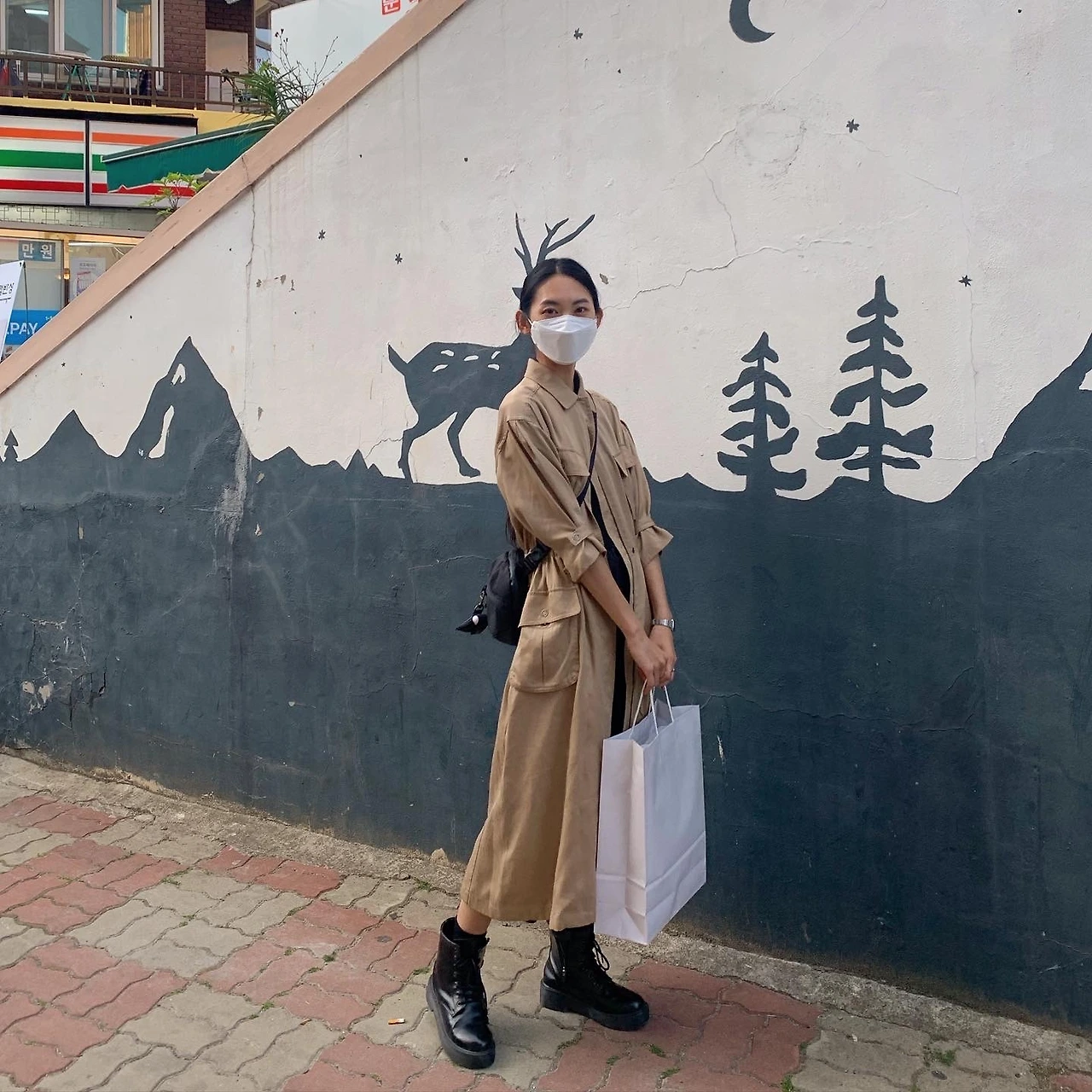 ( L ) 빈티지샵에서 구매한 여성용 사파리 자켓으로 활동적인 느낌과 패셔너블한 느낌을 동시에 준다. 전투화, 작업화의 이미지를 가진 워커로 그 분위기를 더욱 살렸다.