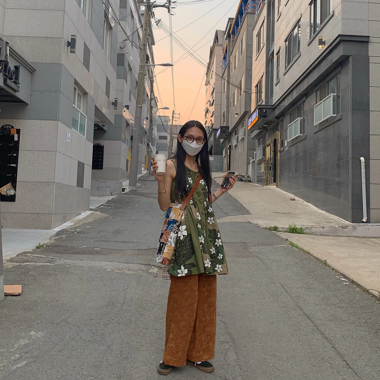 ( L ) 많은 패턴을 조화롭게 소화하는 것에 중점을 두었다. 상하의는 톤온톤으로 패턴이지만 과하지 않은 느낌을 주고 상의의 흰색 꽃무늬가 포인트가 된다. 가방은 또한 패턴이나, 상하의 보다 힘을 주어 오히려 전체적인 무드에서 패턴이라는 포인트를 살려준다.