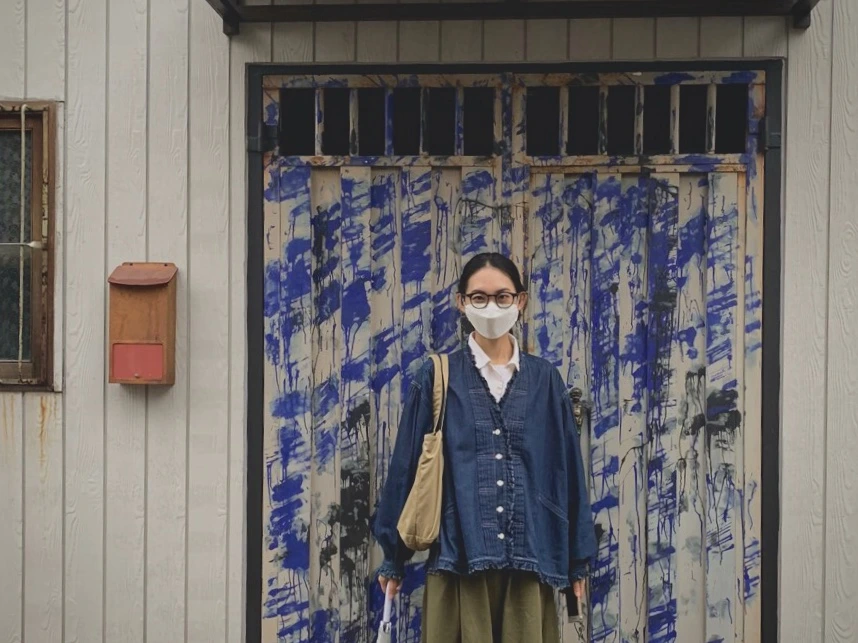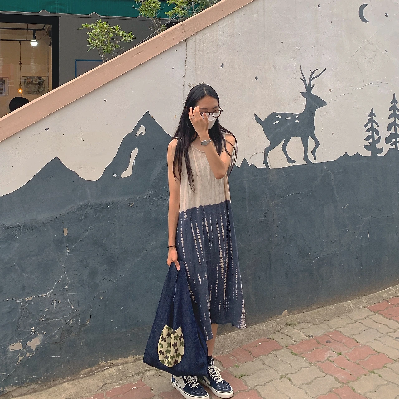 ( R ) 그런지한 느낌을 주는 컬러로 빈티지함이 돋보이는 룩이다. 파란 염색이 번지듯 들어간 원피스와 포켓 디테일이 귀여운 데님 가방에 패치워크 반스화를 신었다. 전체적으로 톤을 맞추어 조화를 이룬 룩이다.