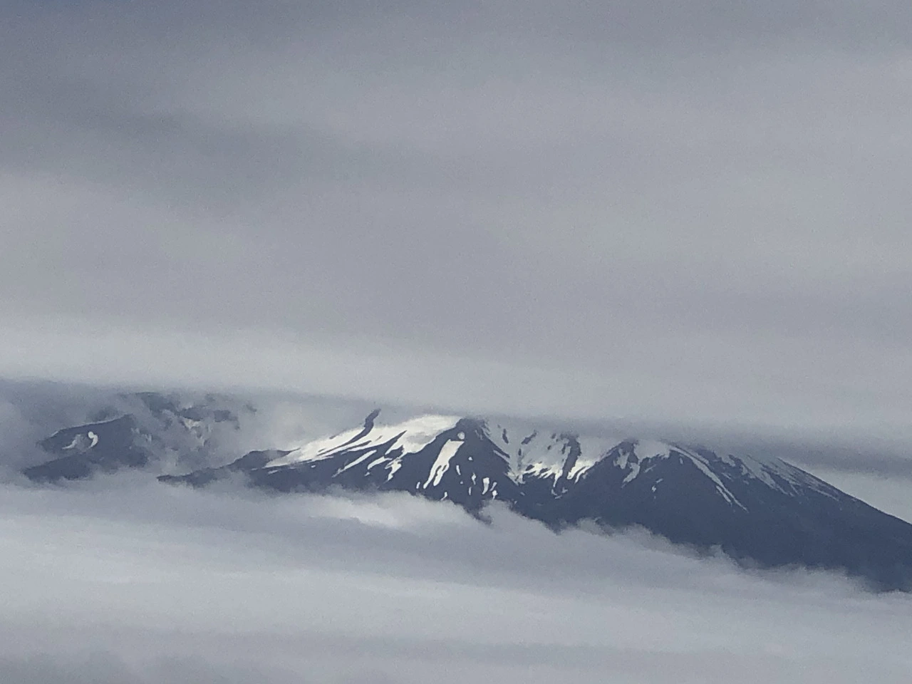 길을 따라 산 등선을 걸으면 왼쪽 편에는 눈에 덮인 상정상이 얼굴을 보여주다 다시금 구름 속으로 감춰 버리기를 반복하고 있고 오른편에는 자욱한 안개가 발아래 산과 마을을 뒤덮어 구름 위를 걷는 기분이다. 어제는 그렇게도 쾌청한 날씨였는데 오늘은 안개, 구름으로 저 아름다운 아래를 내려다볼 수 없어 아쉬울 뿐이다.