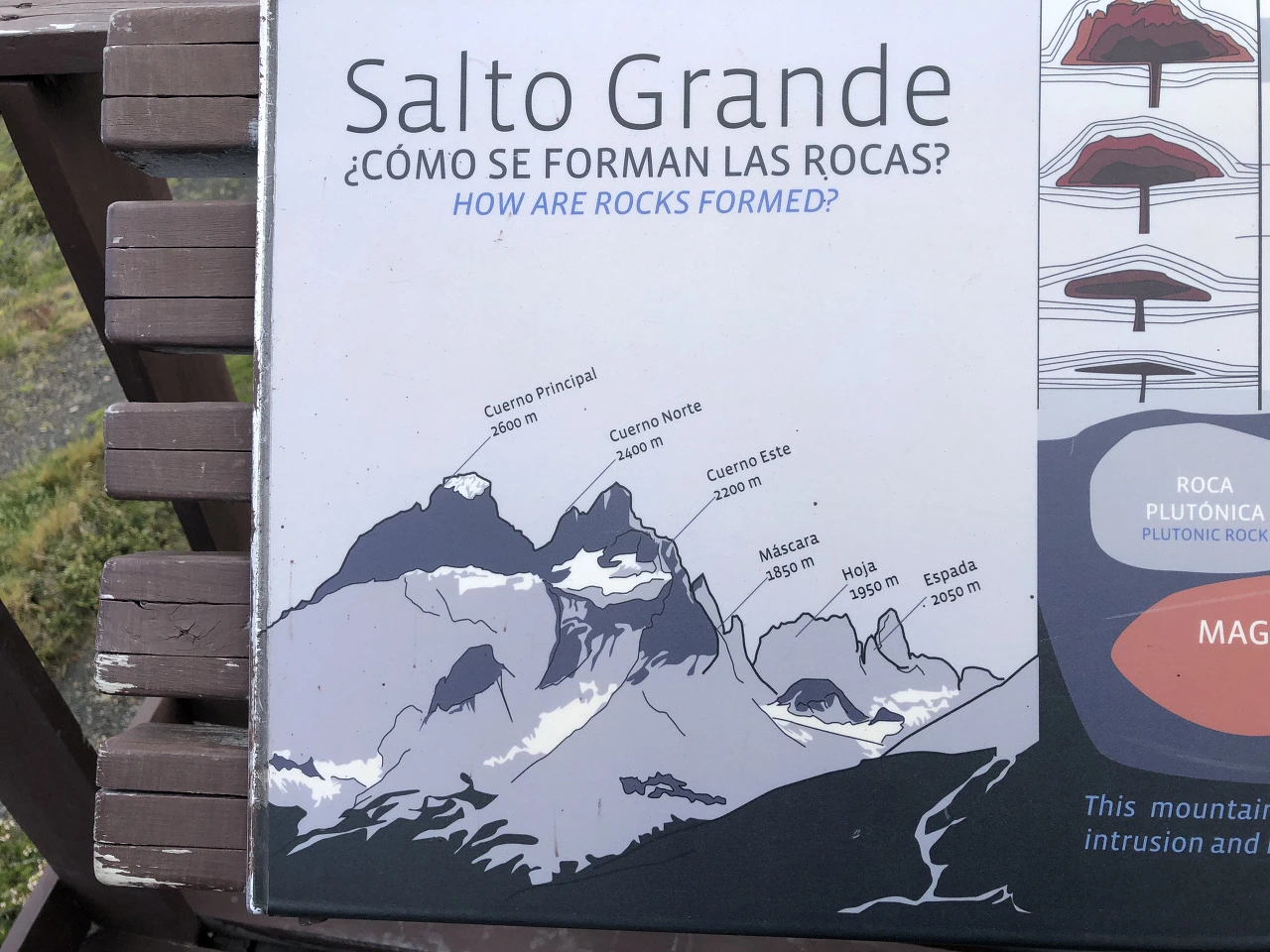 바위산 봉우리 3개가 우뚝 솟아 있는데 봉우리마다 바위를 3등분이라도 해놓은 듯 색깔이 다르다. 변성암, 관입암, 퇴적함의 집합체라고 한다. 거기에다 높이가 3,000미터나 돼 종일 내 구름이 바위에 걸쳐있어 보는 이의 가슴을 조이게 한다. 내가 서 있는 이곳은 호수가이며 고원지대의 여름꽃이 활짝 피어있다.