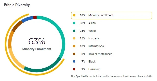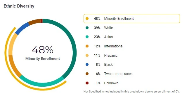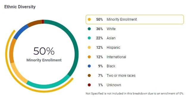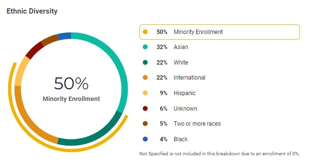 아시아계는 Asian 25%, International 11%이므로 36%이므로 그래도 스탠포드대학은 백인학생 비중이 아시아계보다 높게 나타납니다.