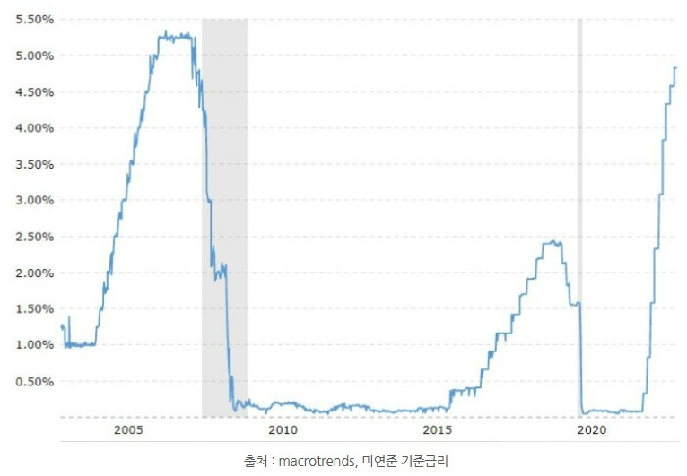 미연준의 기준금리는 2005년부터 인플레이션 잡기 위해 인상이 시작됐습니다.