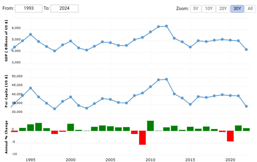 반면, 아래 표에서 일본의 GDP를 보면 과거 30년간 비슷한 수준에서 등락을 거듭하고 있습니다.