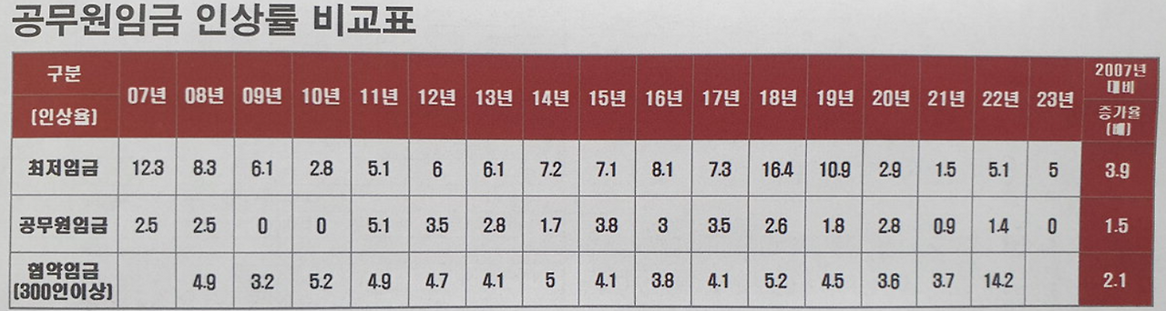 <공무원 임금 인상률 비교표 : 출처 중부매일>
