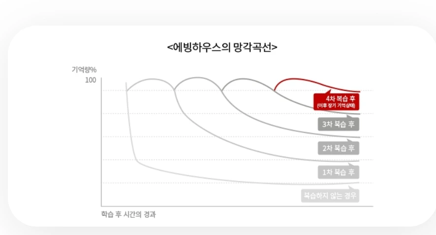 위의 그래프에서 보듯 꾸준한 반복, 간격 학습은 기억의 망각곡선을 크게 상향시켰다.