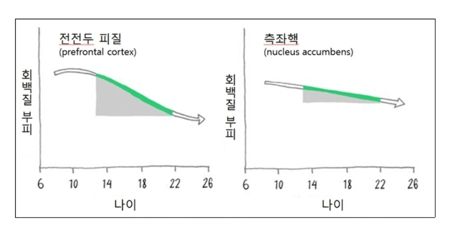 실제 위의 그림에서 보듯 청소년들의 뇌를 보면 이성을 가지고 자신을 통제하는 전두엽(전전두피질)은 아직도 발달할 시기가 많이 남아있는 반면 감성 정보를 처리하고 만족감 쾌감을 관장하는 보상 중추인 측좌핵은 어느 정도 성장이 마무리 되어 성숙단계에 도달했음을 알 수 있다.