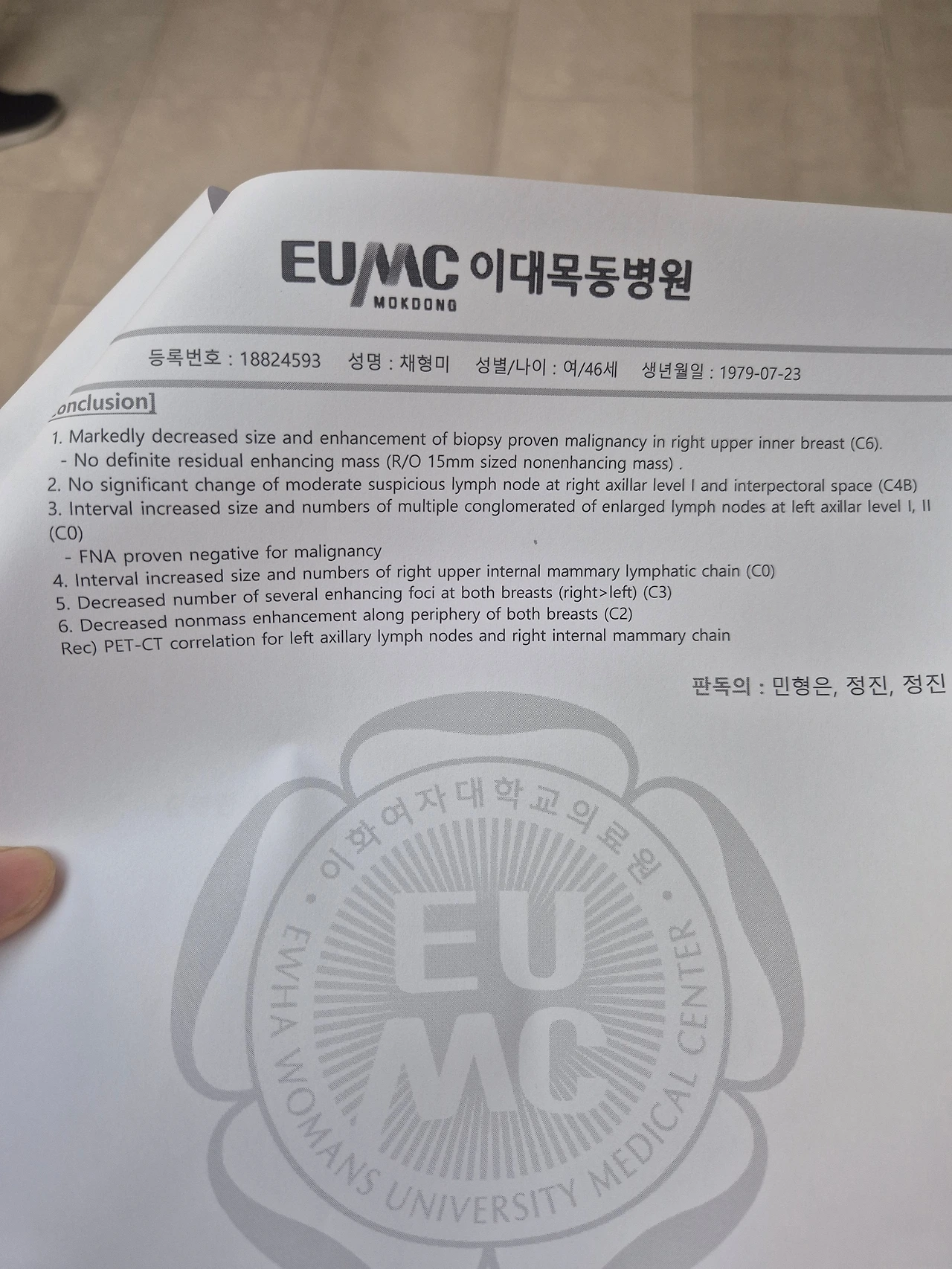 그런데 겨드랑이 림프절은 양쪽이 더 커졌다고 이건 키트루다 계속 써서 없어지든가 아님 수술시 곽청술을 하면 된다고...